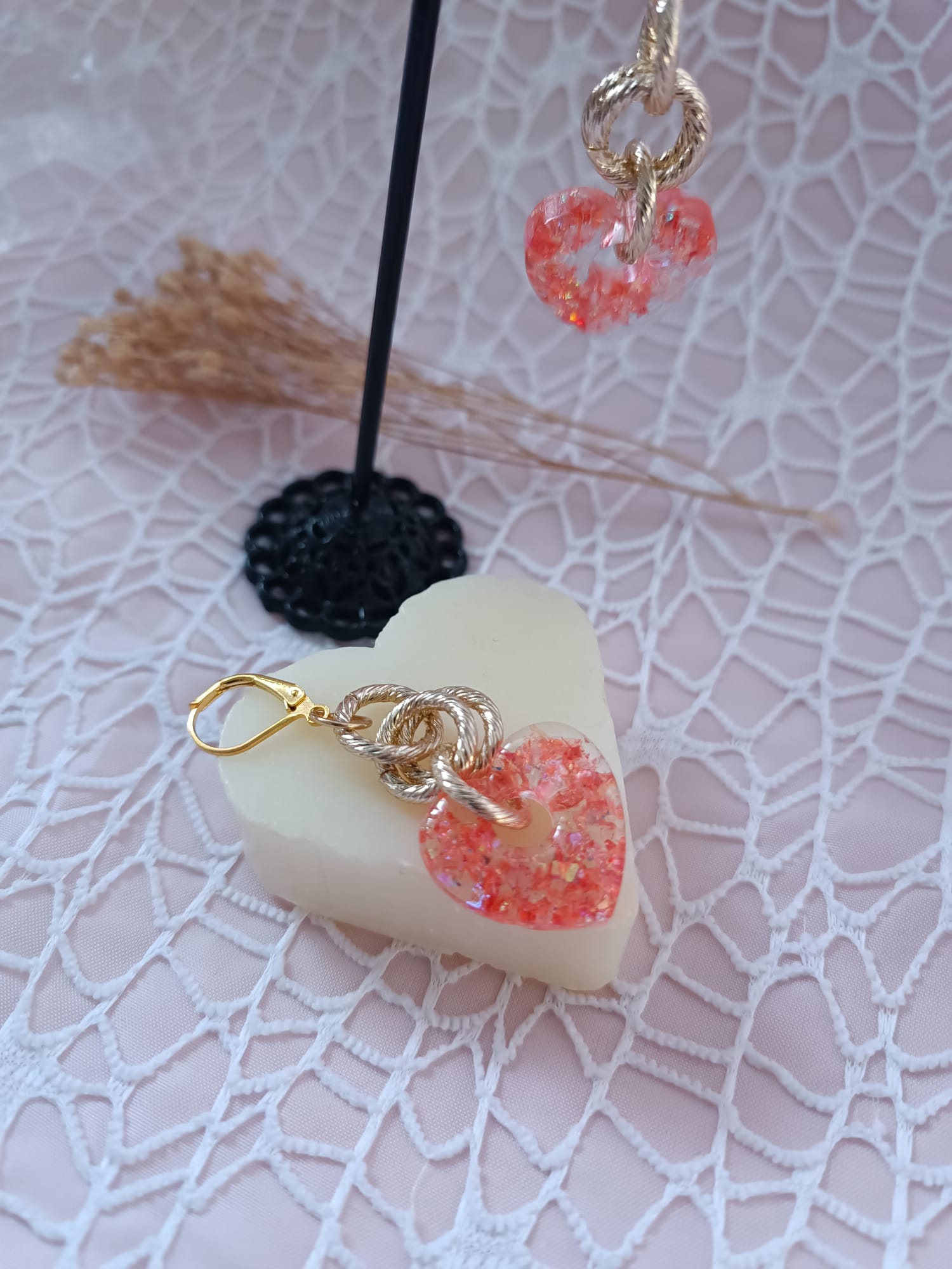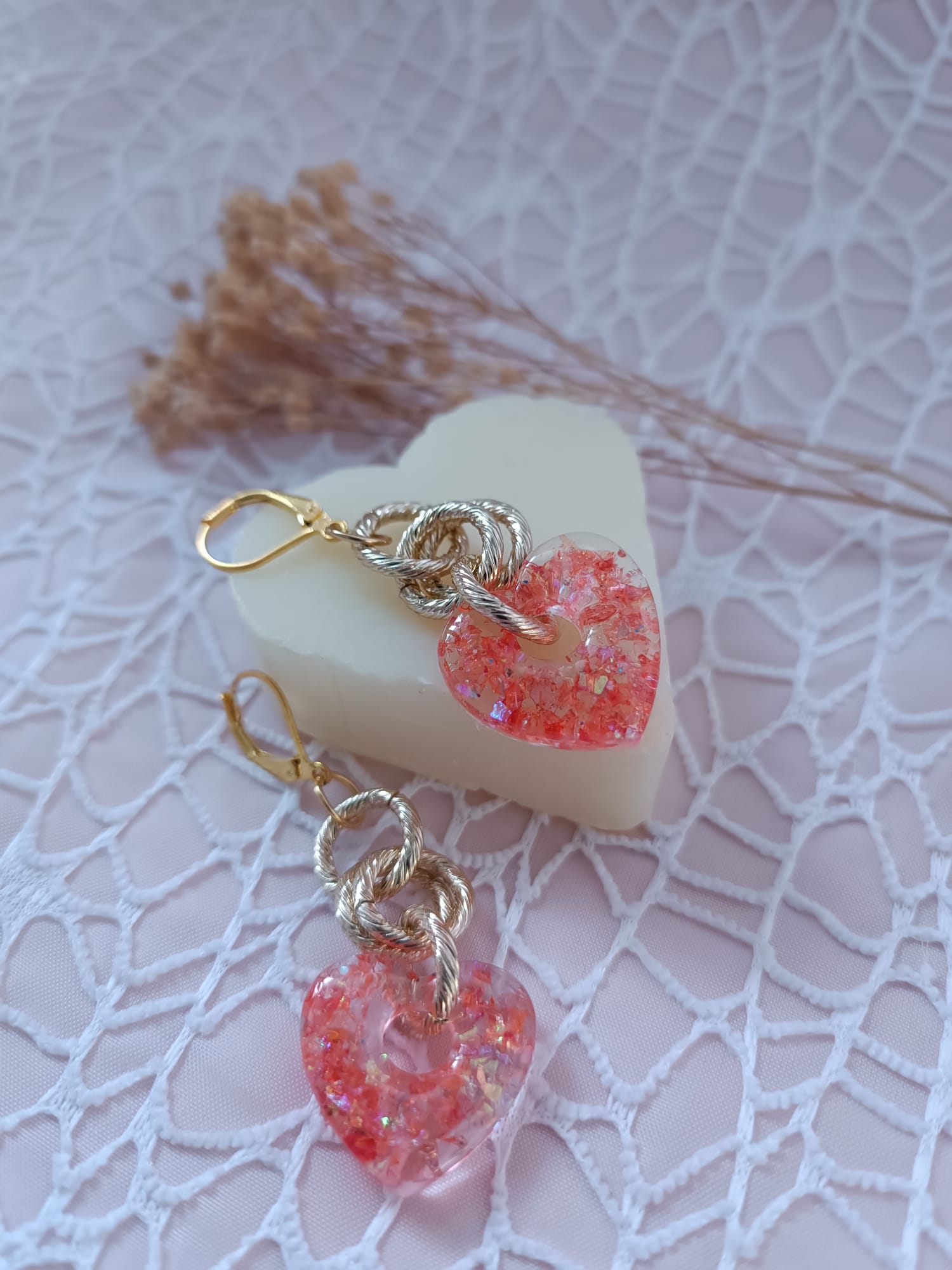 Orecchini Heart realizzati a mano con l'utilizzo della resina liquida , base orecchino in acciaio inossidabile e anallergico .