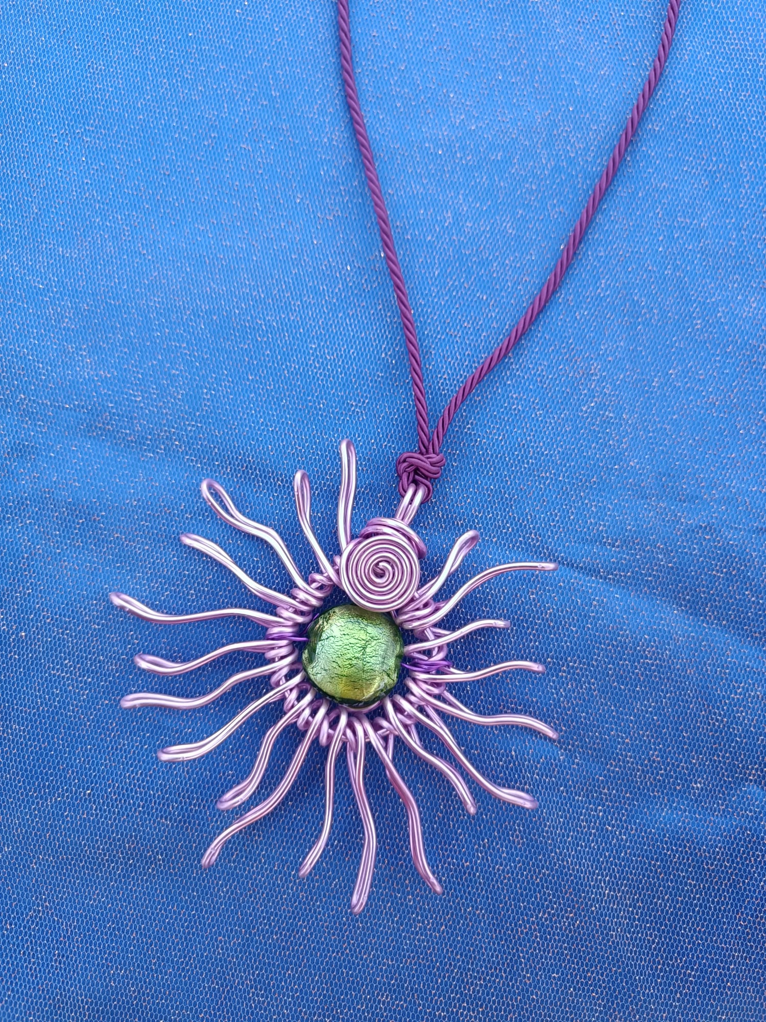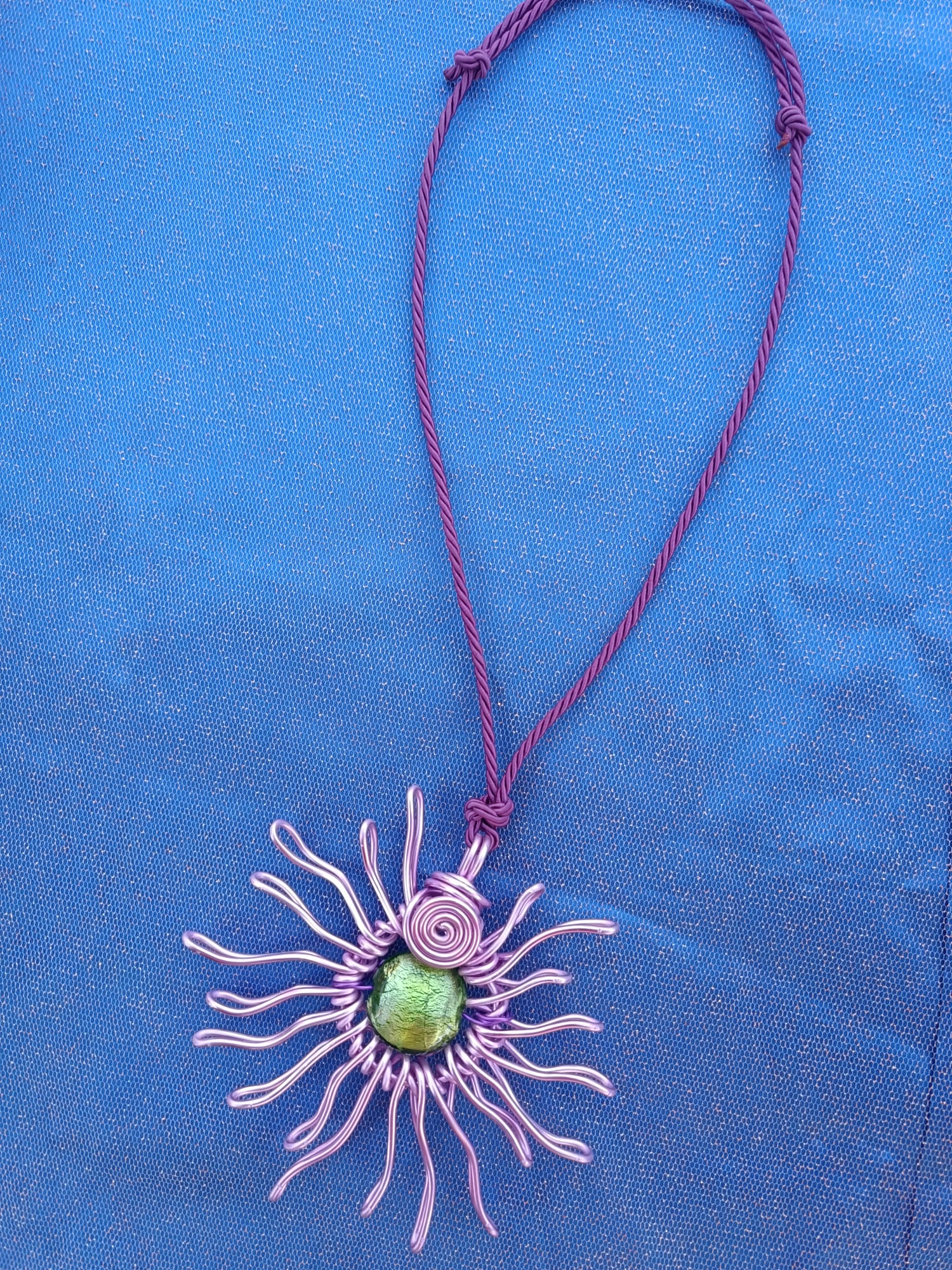 La collana ha un design davvero unico, con un pendente di fili metallici viola intrecciati a forma di sole o fiore, che circondano una pietra verde brillante. L’insieme comunica energia, vitalità, originalità e un tocco artigianale poetico.
